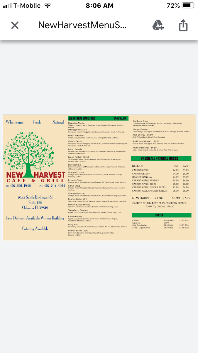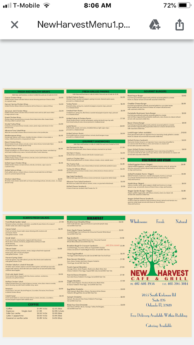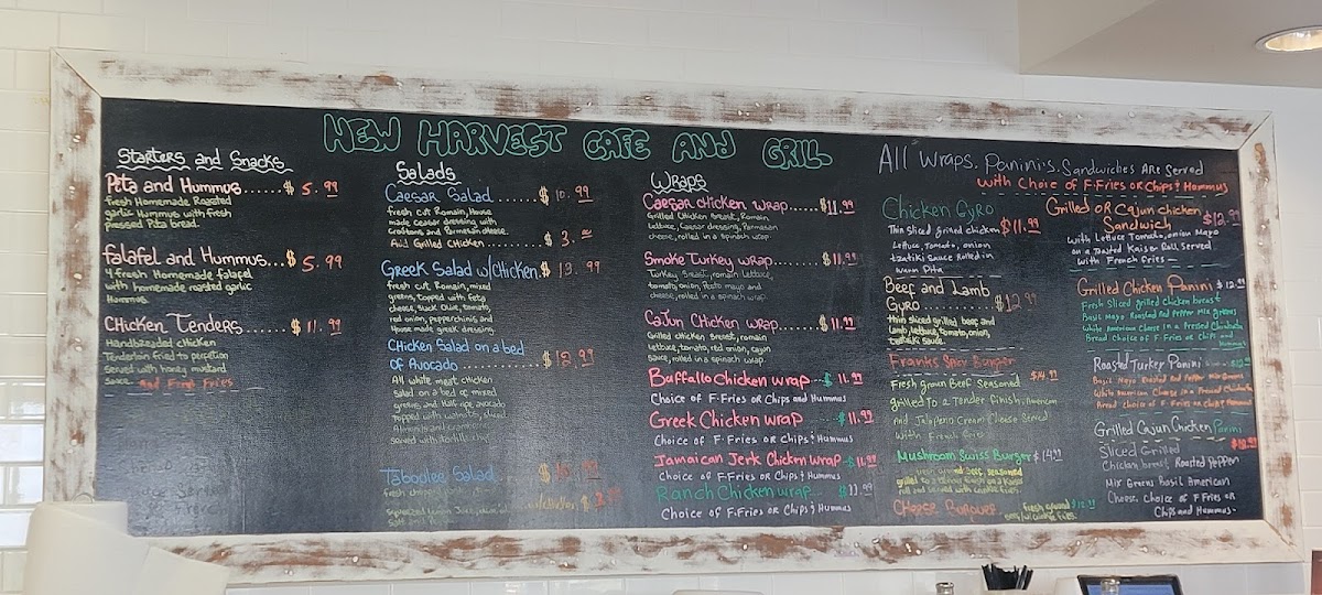 From a reviewer’s perspective, the menu at New Harvest Cafe & Grill feels like a thoughtful wrap-up of comfort food and fresh, health-conscious options, making it appealing to a wide range of diners. The salad selection stands out for its balance between light and satisfying choices, with classics like Tabbouleh Salad and Caesar Salad, alongside more filling options such as Chicken Salad On A Bed Of Avocado and Greek Salad With Chicken, which add protein without sacrificing freshness. For those seeking plant-based meals, the Vegan & Vegetarian section is impressively diverse, featuring flavorful items like Falafel Wrap!, Portobello Mushroom Panini, Impossible Meat Burger, Black Bean Burger, and the wholesome Tabbouleh Platter, all of which show a clear effort to cater to modern dietary preferences. The wraps and sandwiches lean into bold, familiar flavors, with options such as Buffalo Chicken Wrap, Buffalo Or Bbq Zingers, Mushroom Swiss Burger, Cajun Chicken Panini, and Ranch Chicken Wrap, making this section ideal for guests craving something hearty and indulgent. To round out the experience, the Starters and Snacks provide great shareable bites, including Chicken Tenders, Coconut Shrimp, Falafel And Hummus, and Pita And Hummus, which set the tone for a relaxed and satisfying meal. Overall, the menu at New Harvest Cafe & Grill comes across as well-rounded and approachable, successfully combining fresh Mediterranean-inspired dishes with classic American comfort foods, leaving diners with a clear sense of variety, value, and consistency.